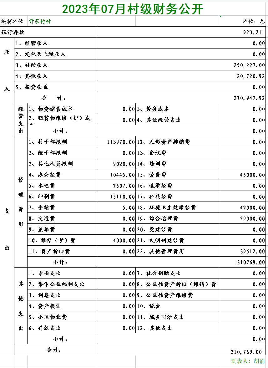 舒家村村2023年07月村级财务公开