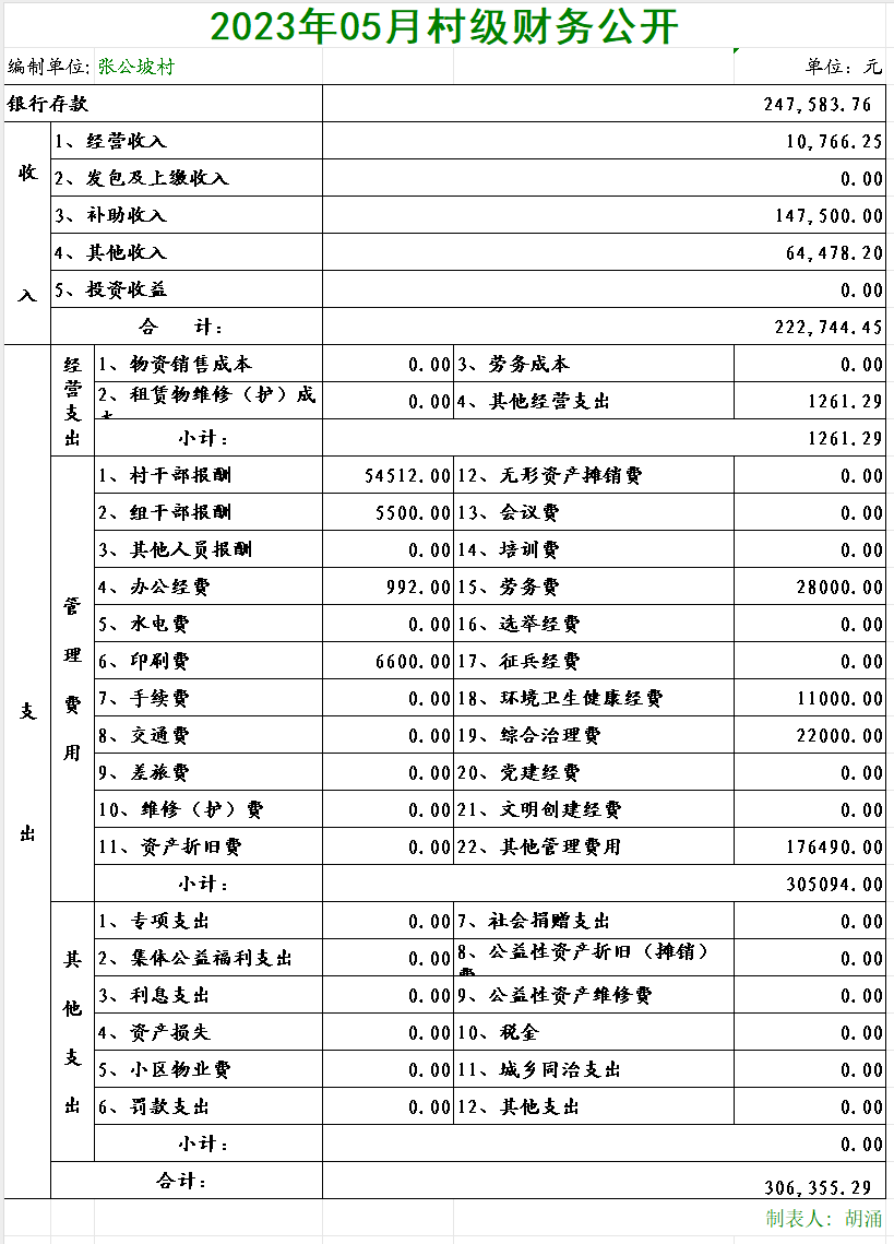 张公坡村2023年05月村级财务公开
