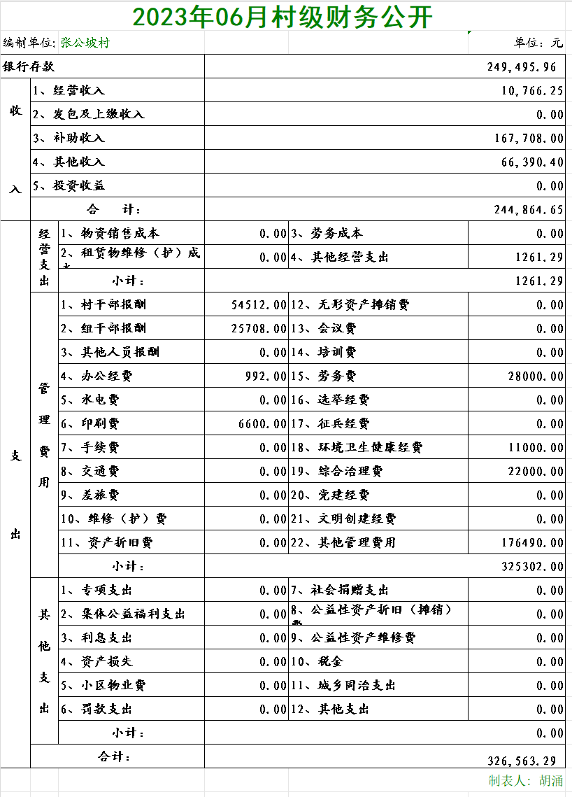 张公坡村2023年06月村级财务公开
